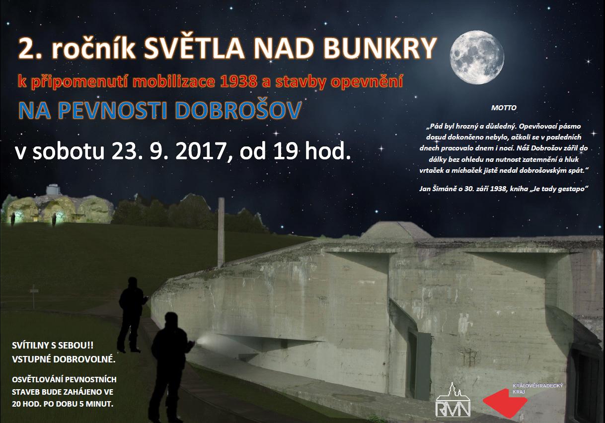 2. ročník akce Světla nad bunkry k připomenutí mobilizace 1938 a stavby opevnění na Pevnosti Dobrošov proběhne v sobotu 23.9.2017 od 19,00 hodin.