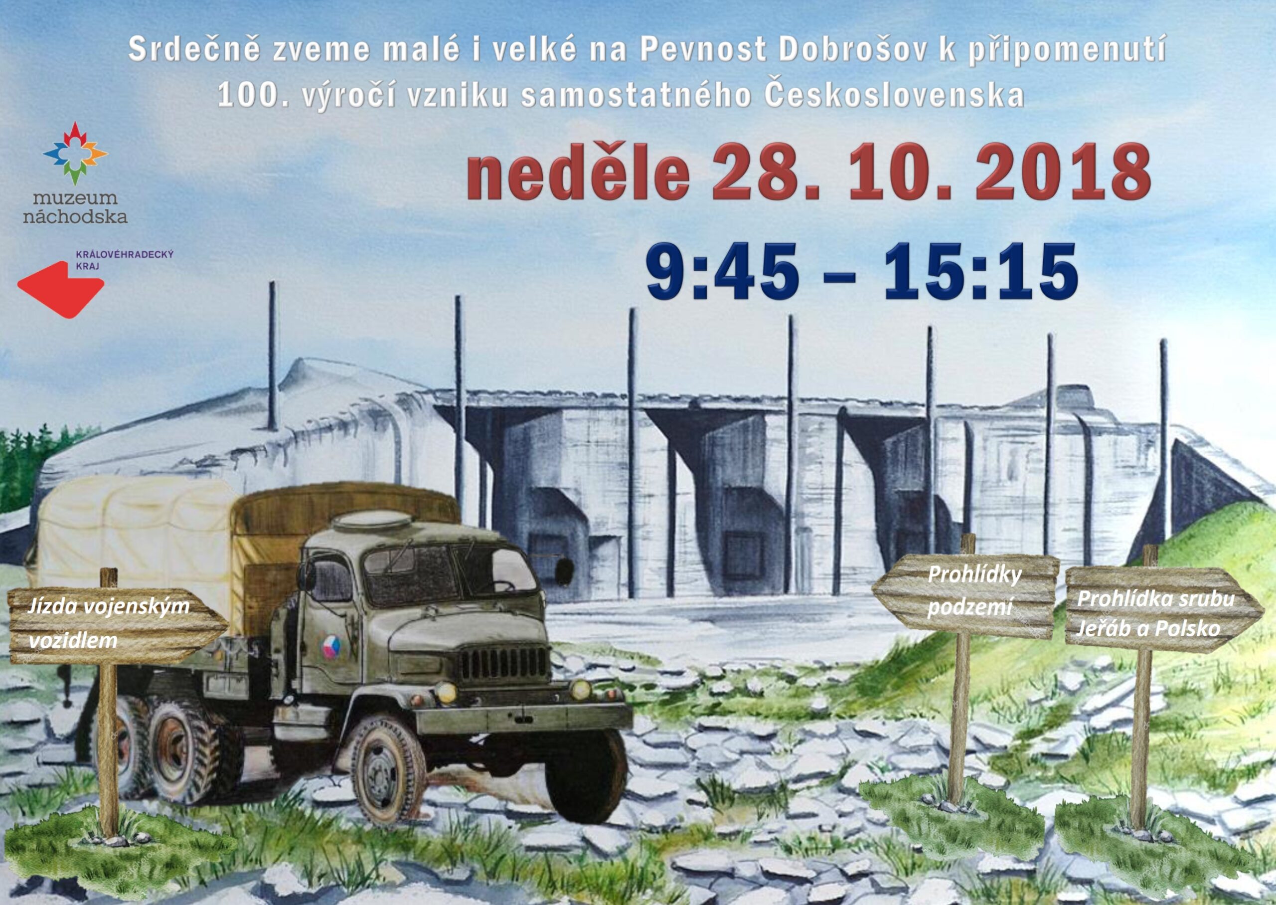 Srdečně zveme v neděli 28. října malé i velké návštěvníky do Pevnosti Dobrošov k připomenutí stého výročí vzniku samostatného Československa. Můžete se těšit na Jízdu vojenským vozidlem, prohlídky podzemí a mimořádné prohlídky pěchotních srubů Jeřáb a Polsko.