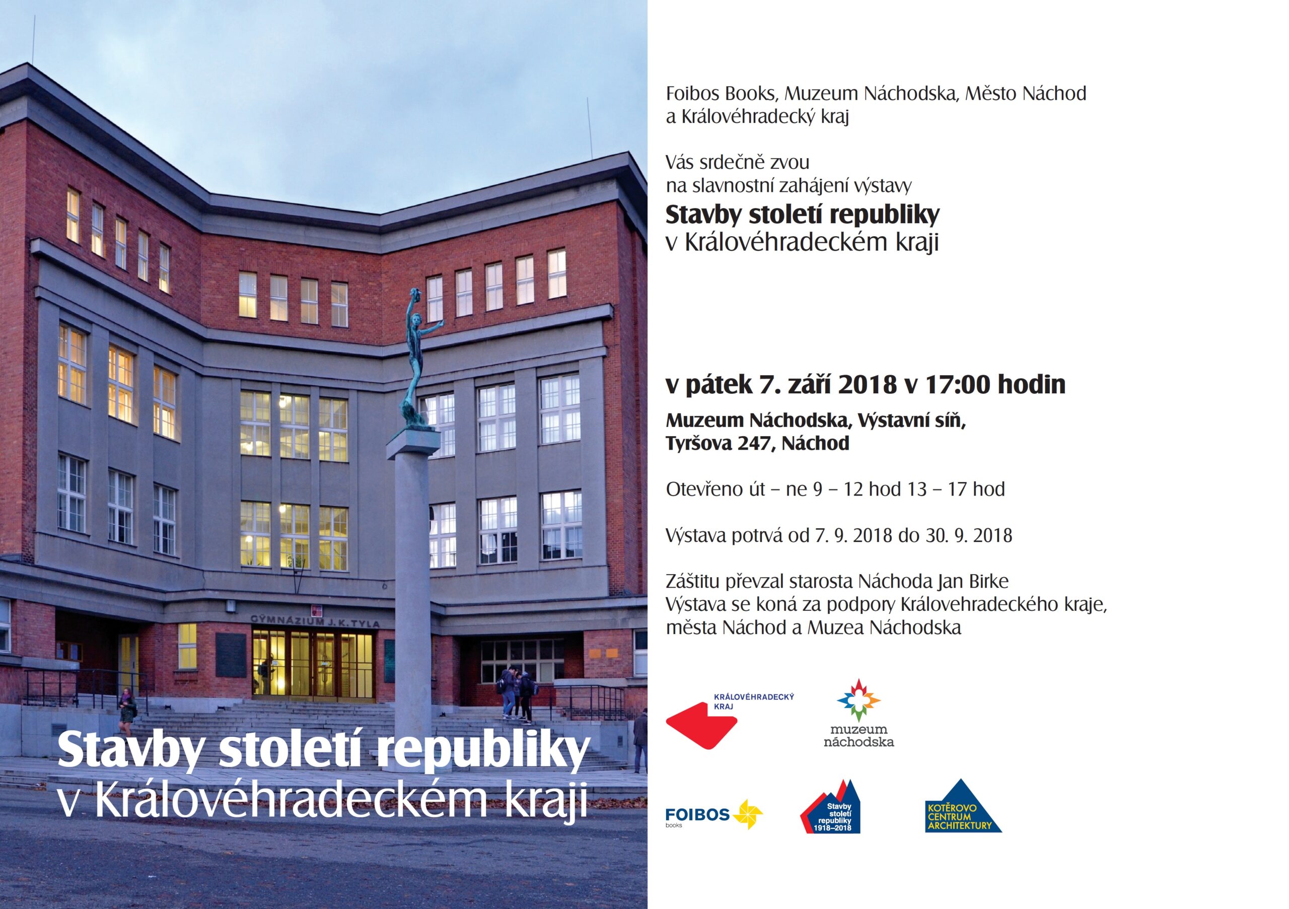 Foibos Books, Muzeum Náchodska, Město Náchod a Královéhradecký kraj Vás srdečně zvou na slavnostní zahájení výstavy Stavby století republiky v Královéhradeckém kraji v pátek 7. září 2018 v 17:00 hodin Muzeum Náchodska, Výstavní síň,Tyršova 247, Náchod. Výstava potrvá od 7. 9. 2018 do 30. 9. 2018, otevřeno úterý až neděle 9 – 12 hod 13 – 17 hod. Záštitu převzal starosta Náchoda Jan Birke. Výstava se koná za podpory Královéhradeckého kraje, města Náchod a Muzea Náchodska