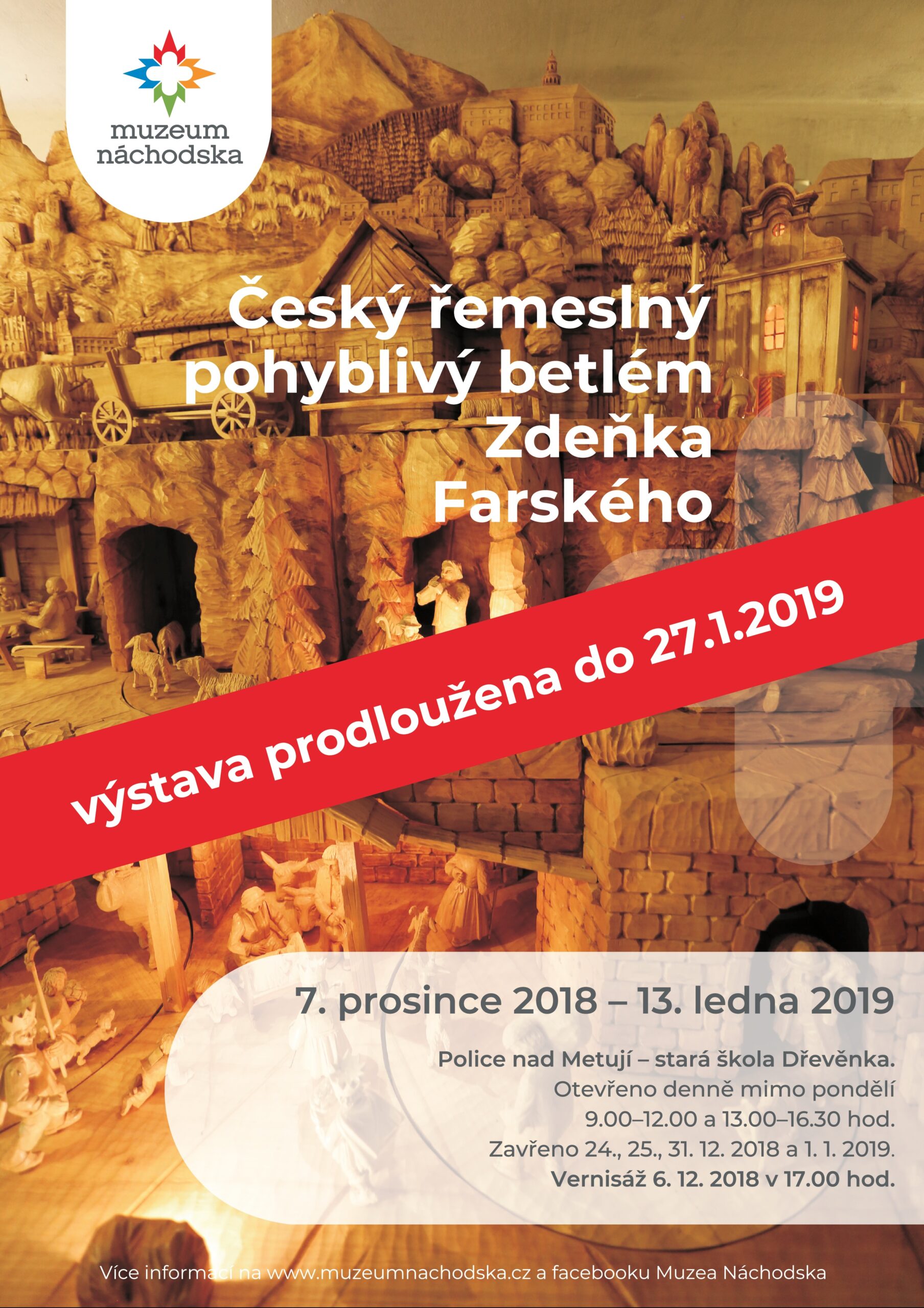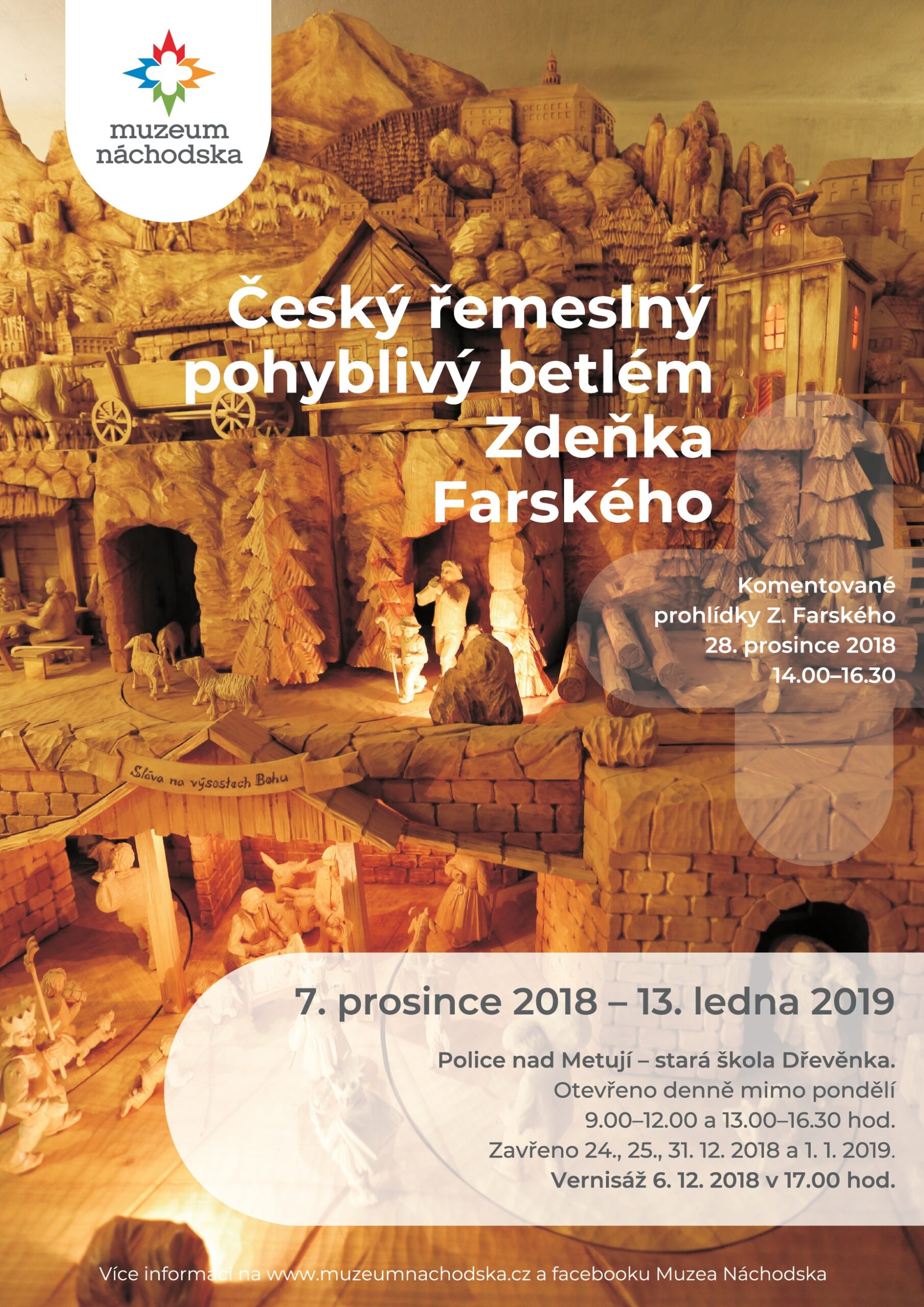Muzeum Náchodska zve návštěvníky do Police nad Metují do staré školy Dřevěnky na Český řemeslný pohyblivý betlém. Pro návštěvníky je připravena unikátní příležitost zhlédnout monumentální čtyři metry dlouhý a dva metry vysoký mechanický betlém náchodského řezbáře Zdeňka Farského. Betlém doplní menší výstava historických hraček ze sbírek Muzea Náchodska. Vernisáž výstavy proběhne za účasti autora ve čtvrtek 6. prosince 2018 od 17.00 hod. Výstavu lze pak navštívit od 7. prosince 2018 do 27. ledna 2019. Otevřeno bude denně mimo pondělky. O vánočních svátcích 24. a 25. 12. 2018 bude zavřeno. Zavřeno bude také na Silvestra (31. 12.) a na Nový rok (1.1.). V pátek 28. prosince 2018 budou od 14.00 do 16.30 probíhat komentované prohlídky, kterými návštěvníky provede autor betlému Zdeněk Farský.