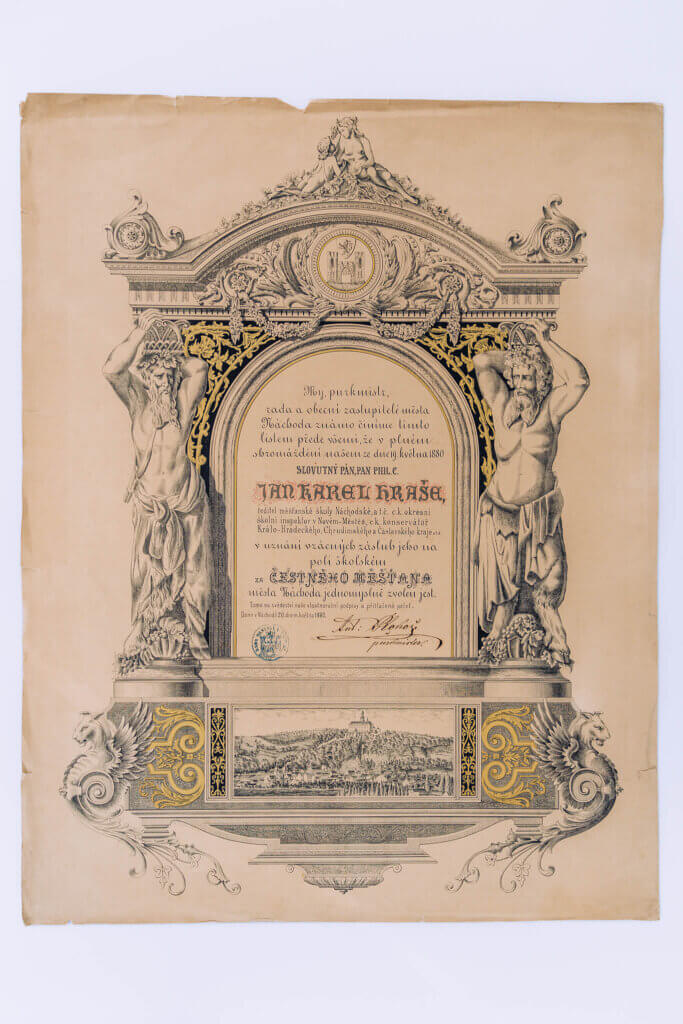 My, purkmistr rada a obecní zastupitelé města Náchoda známo činíme tímto listem přede všemi, že v plném shromáždění našem ze dne 19. května 1880 slovutný pán, pan Phil. C. Jan Karel Hraše, ředitel měšťanské školy náchodské, a toho času c.k. školní inspektor v Novém Městě, c.k. konzervátor Králo-Hradeckého, Chrudimského a Čáslavského kraje, v uznání vzácných zásluh jeho na poli školském za čestného měšťana města Náchoda jednomyslně zvolen jest. Tomu na svědectví naše vlastnoruční podpisy a přitlačená pečeť.