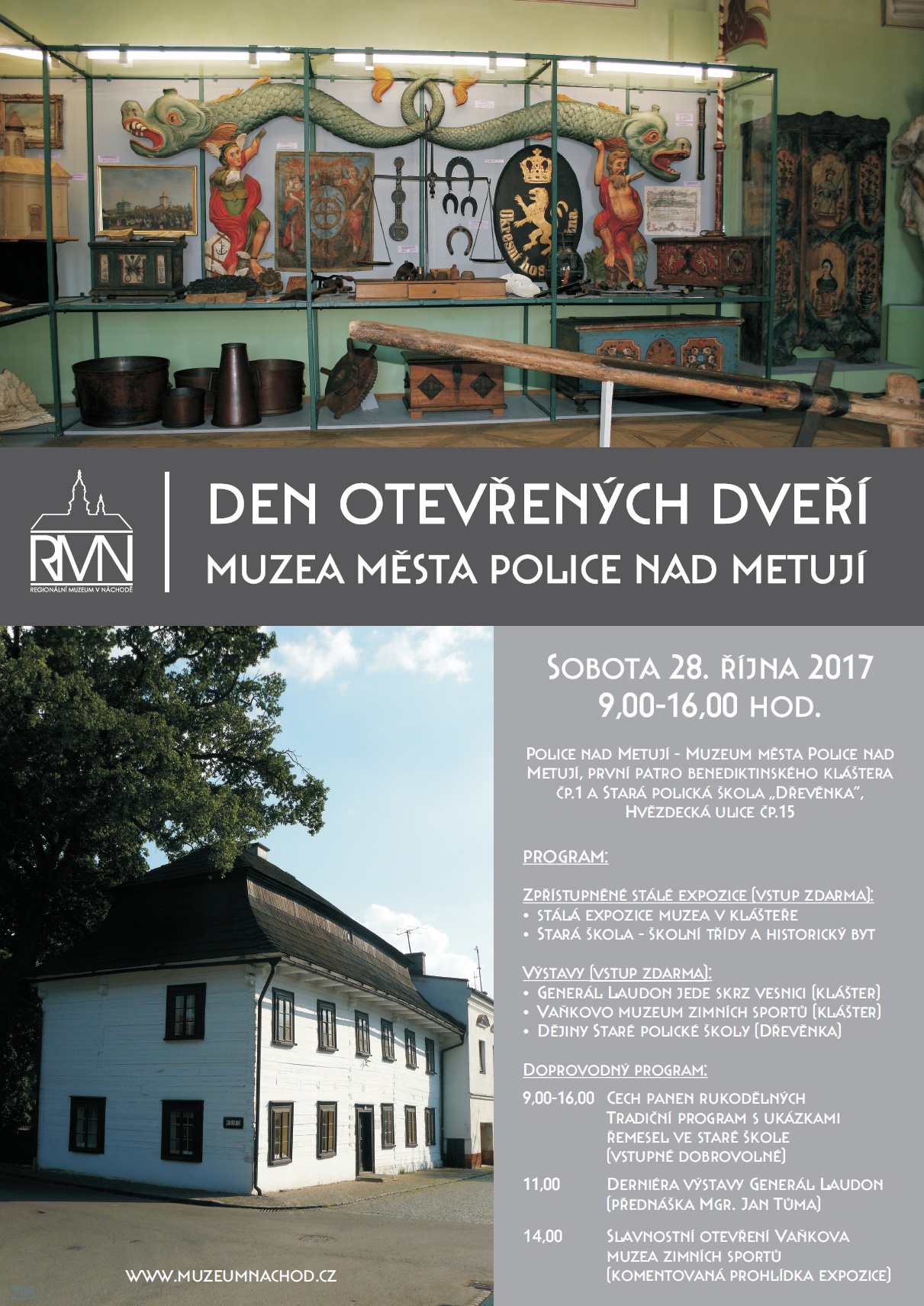 Regionální muzeum v Náchodě zve návštěvníky u příležitosti státního svátku 28. října tradiční den otevřených dveří do Muzea města Police nad Metují. Od 9,00 do 16,30 hod. bude možno navštívit stálou expozici muzea v benediktinském klášteře, výstavu Generál Laudon jede skrz vesnici, starou školu Dřevěnku s malou expozicí o dějinách staré školy, a také nově otevřenou expozici Vaňkova muzea zimních sportů. Vstup do všech částí expozice a na všechny výstavy zdarma.
