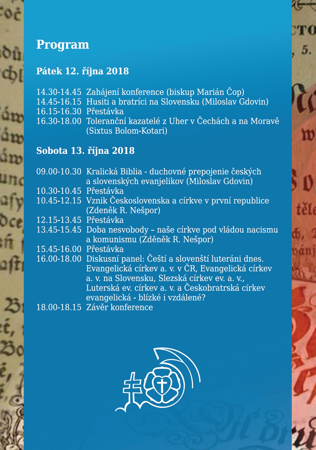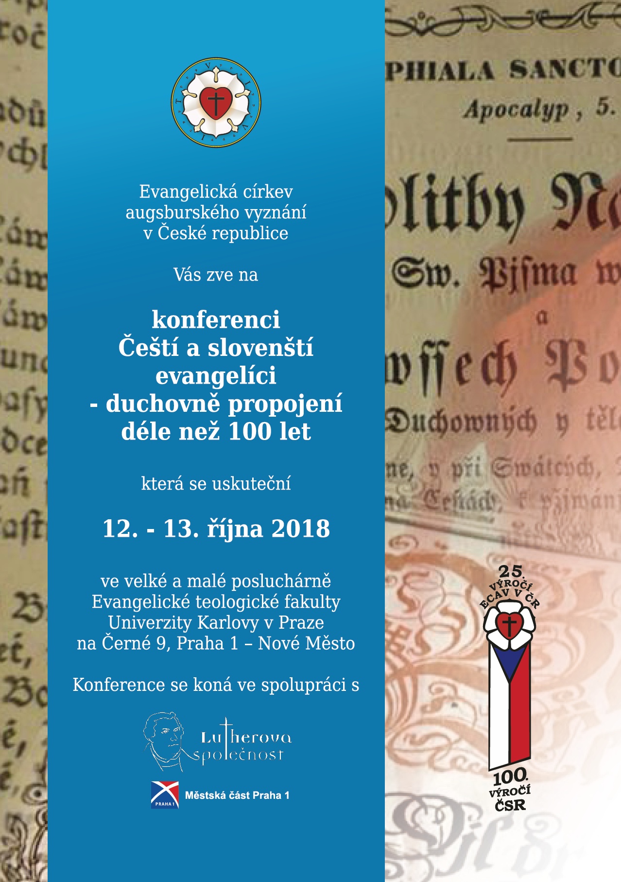 Zveme Vás na konferenci ke stoletému výročí samostatnosti Československa a společným církevním dějinám “Čeští a slovenští evangelíci – duchovně propojení déle než 100 let”, která se bude konat ve dnech 12.–13. října 2018 na Evangelické teologické fakultě Univerzity Karlovy v Praze (Černá 9, Praha 1 – Nové Město).
