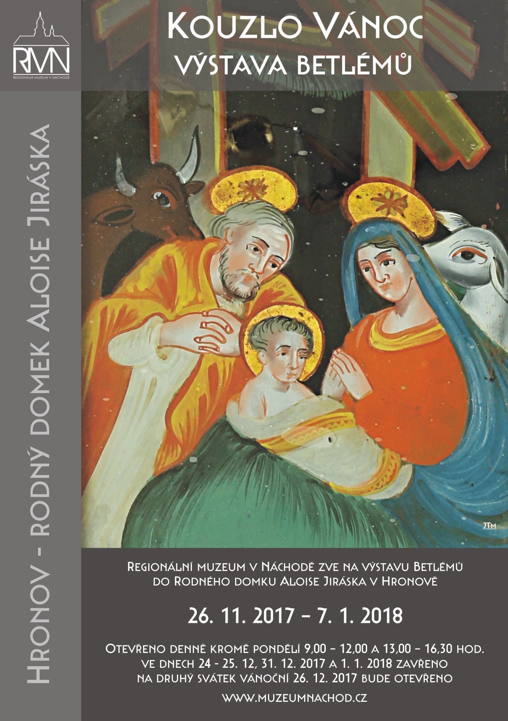 Regionální muzeum v Náchodě zve od 26. 11. 2017 do 7. 1. 2018 na výstavu Betlémů do Rodného domku Aloise Jiráska v Hronově. Otevřeno denně kromě pondělí 9,00 – 12,00 a 13,00 – 16,30 hod. Ve dnech 24 - 25. 12, 31. 12. 2017 a 1. 1. 2018 zavřeno, na druhý svátek vánoční 26. 12. 2017 bude otevřeno