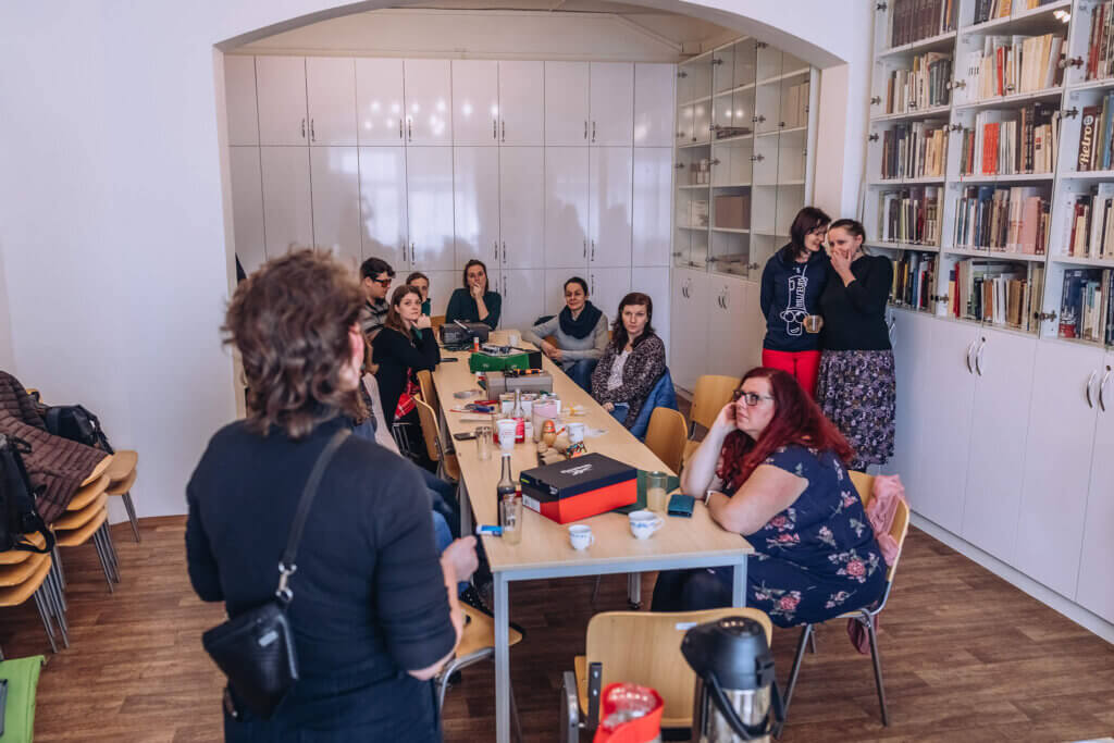 V dopoledním bloku účastníky muzejní edukátorka Mgr. Kateřina Šichanová seznámila s edukačními programy Život v chalupě a Pověst o Brunclíkovi. Na tento program navazovala diskuze u „kulatých stolů“, během níž bylo možné představené programy komentovat a sdílet vlastní zkušenosti.