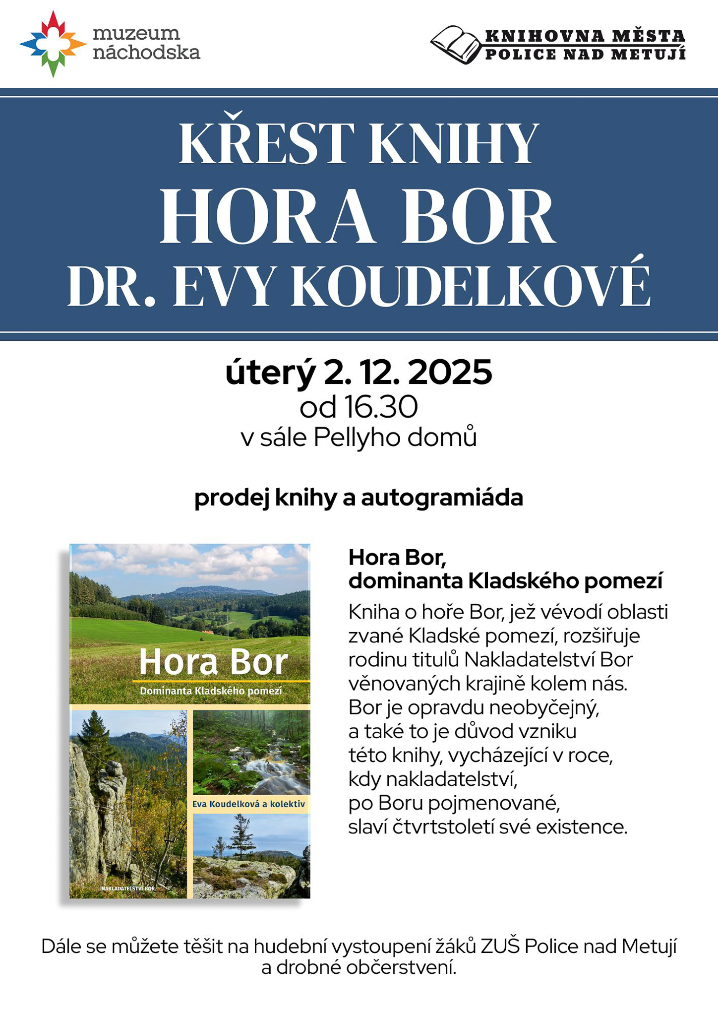 Knihovna města Police nad Metují vás ve spolupráci s Muzeem Náchodska zve na slavnostní křest knihy Hora Bor Dr. Evy Koudelkové. Akce se uskuteční v úterý 2. prosince 2025 od 16.30 v sále Pellyho domů v Polici nad Metují. Zároveň se křtem oslavíme také 25. výročí od založení Nakladatelství Bor.