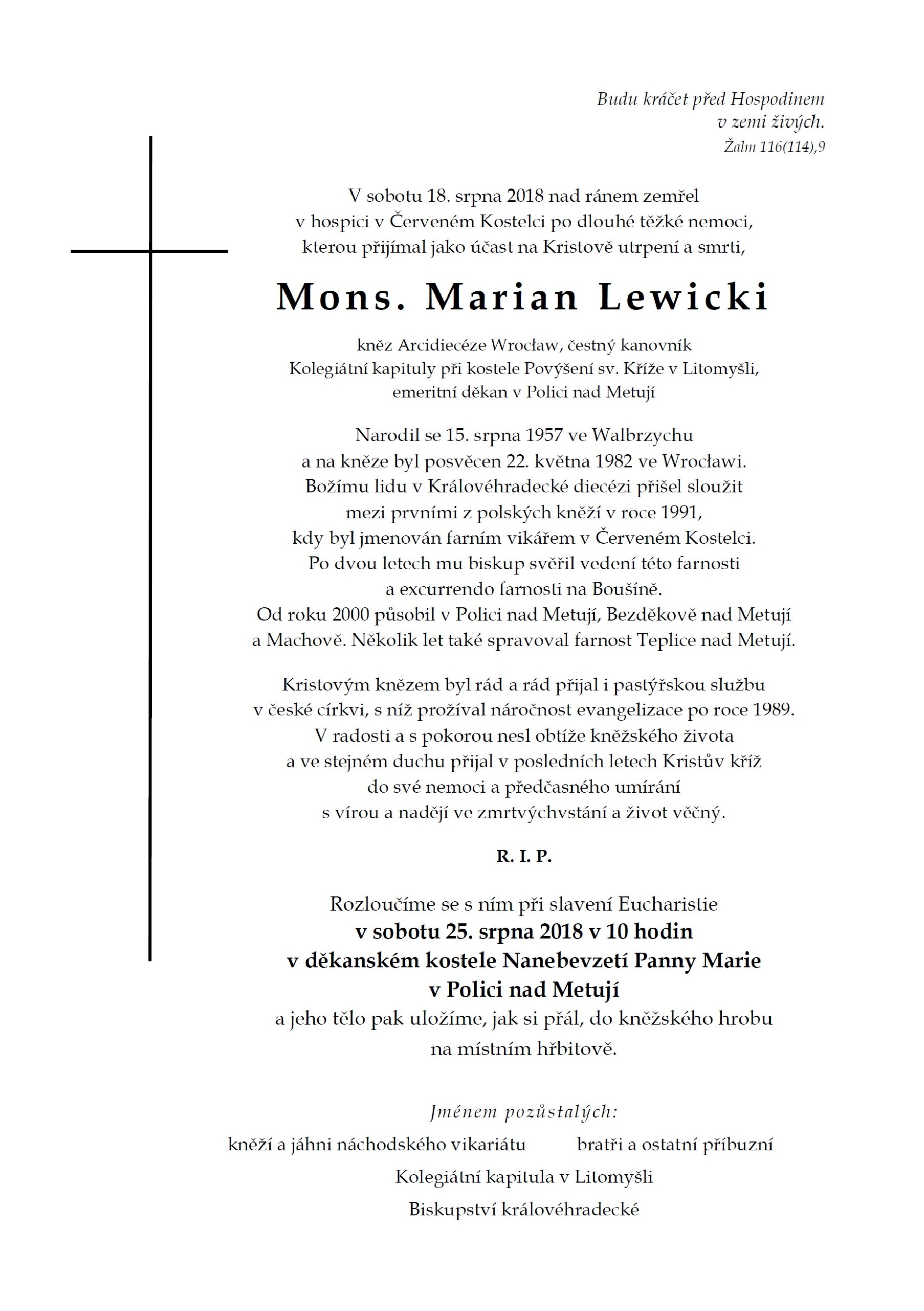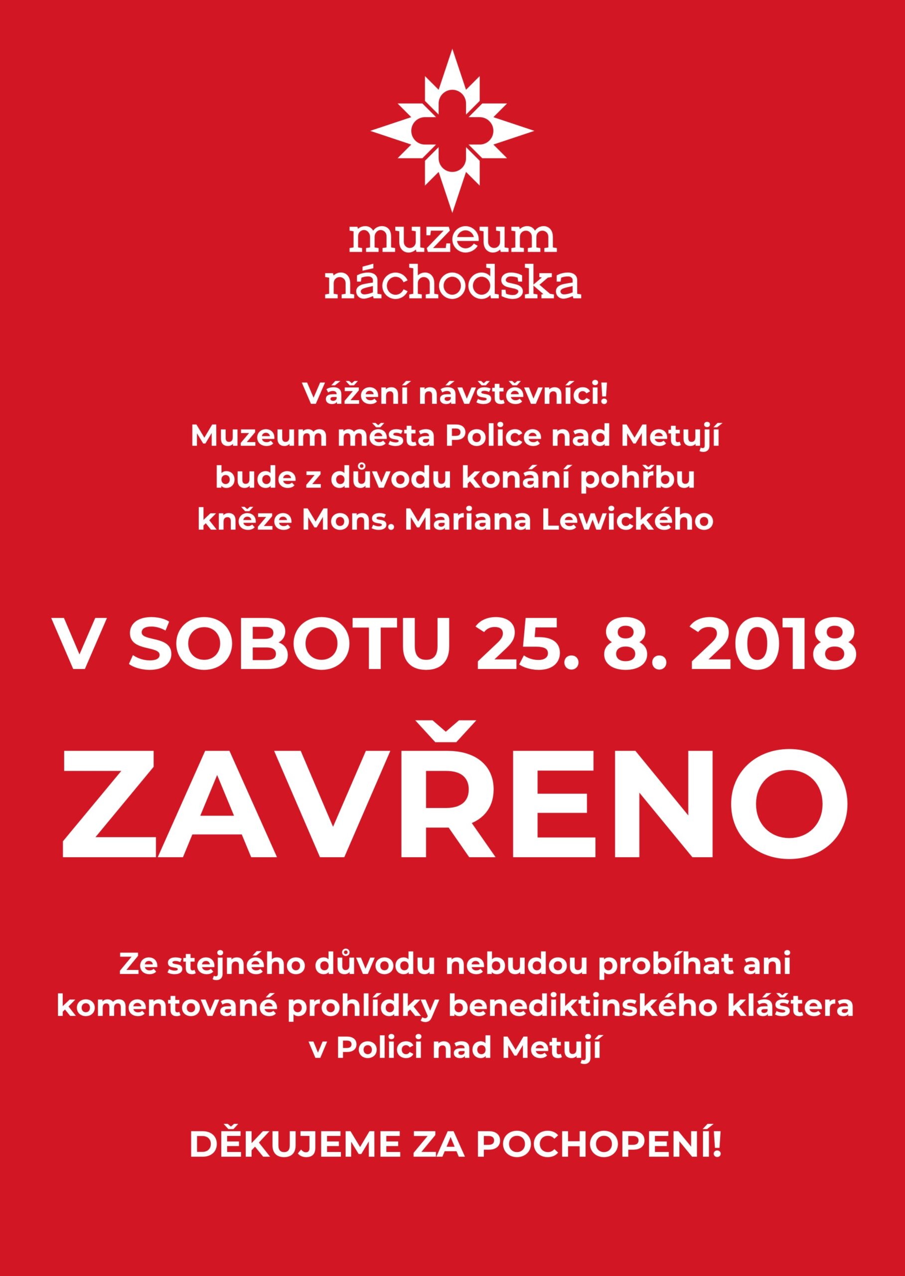 Vážení návštěvníci! Muzeum Města Police nad Metují bude z důvodu konání pohřbu polického kněze Mons. Mariana Lewického