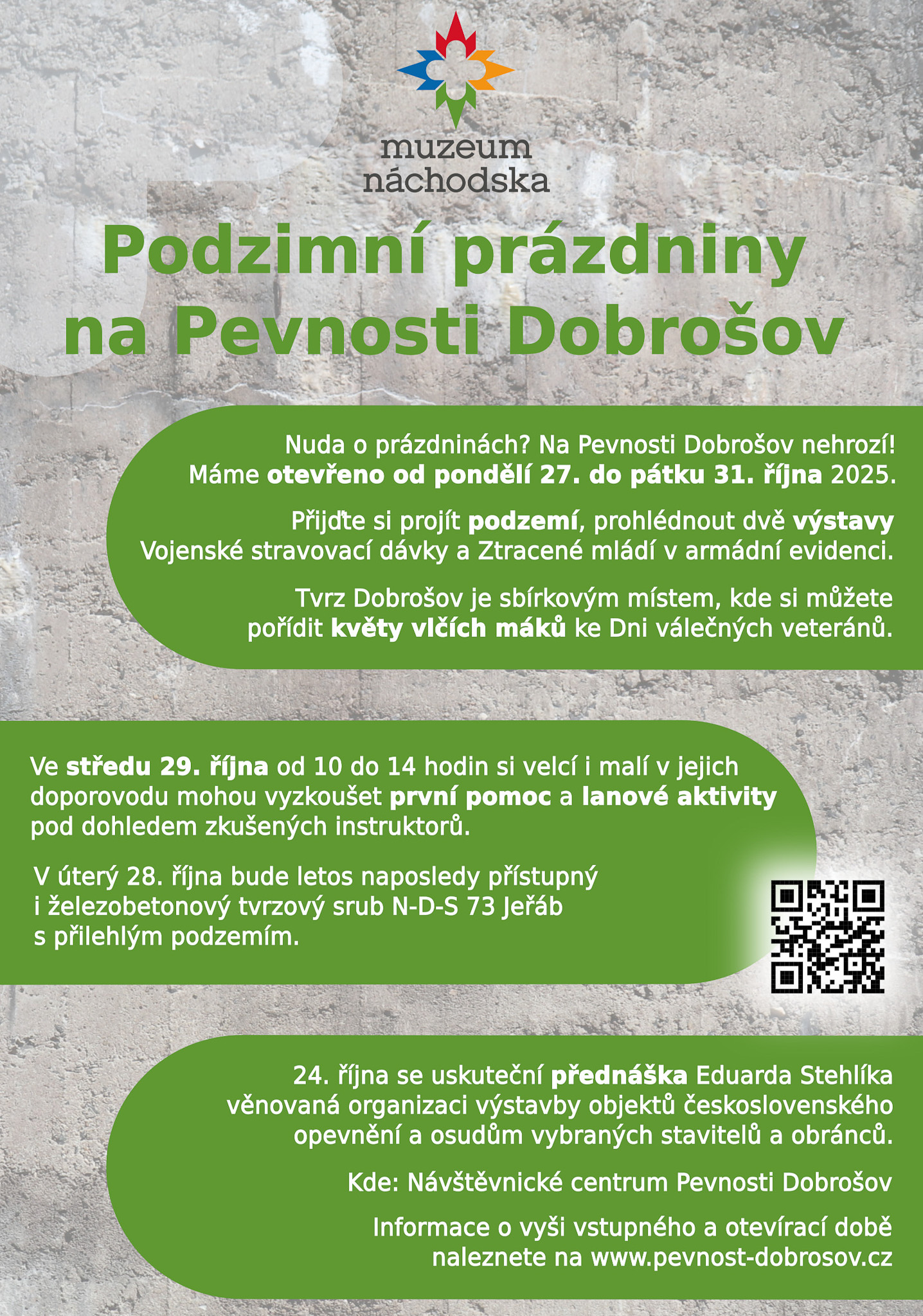 Pevnost Dobrošov bude mimořádně otevřena i během podzimních prázdnin od pondělí 27. do pátku 31. října 2025.