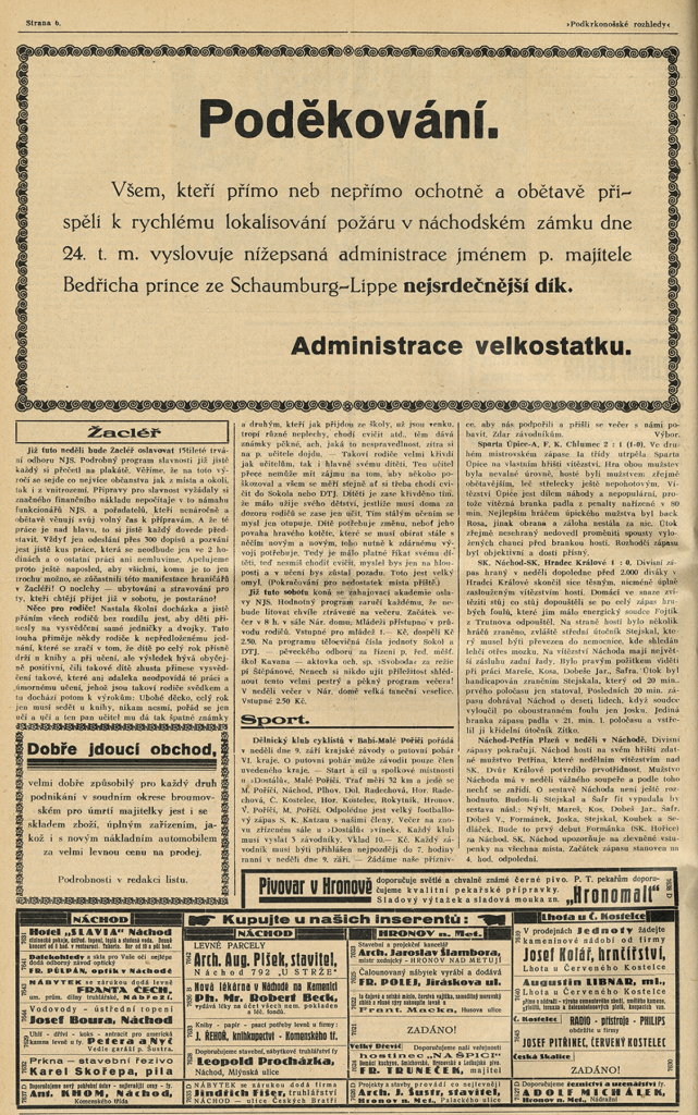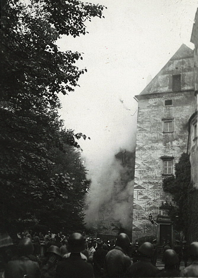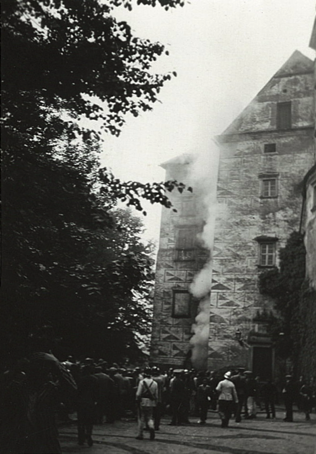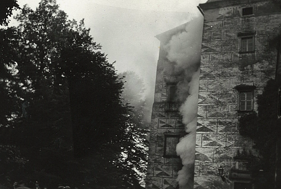 Před devadesáti lety, 24. srpna 1934, vypukl na náchodském zámku požár. Jak bylo zaznamenáno v náchodské kronice (Archiv města Náchod), zámecký personál slyšel praskot již ve 3 hodiny ráno, zkraje jej však považoval za vzdálenou střelbu nočního vojenského cvičení.