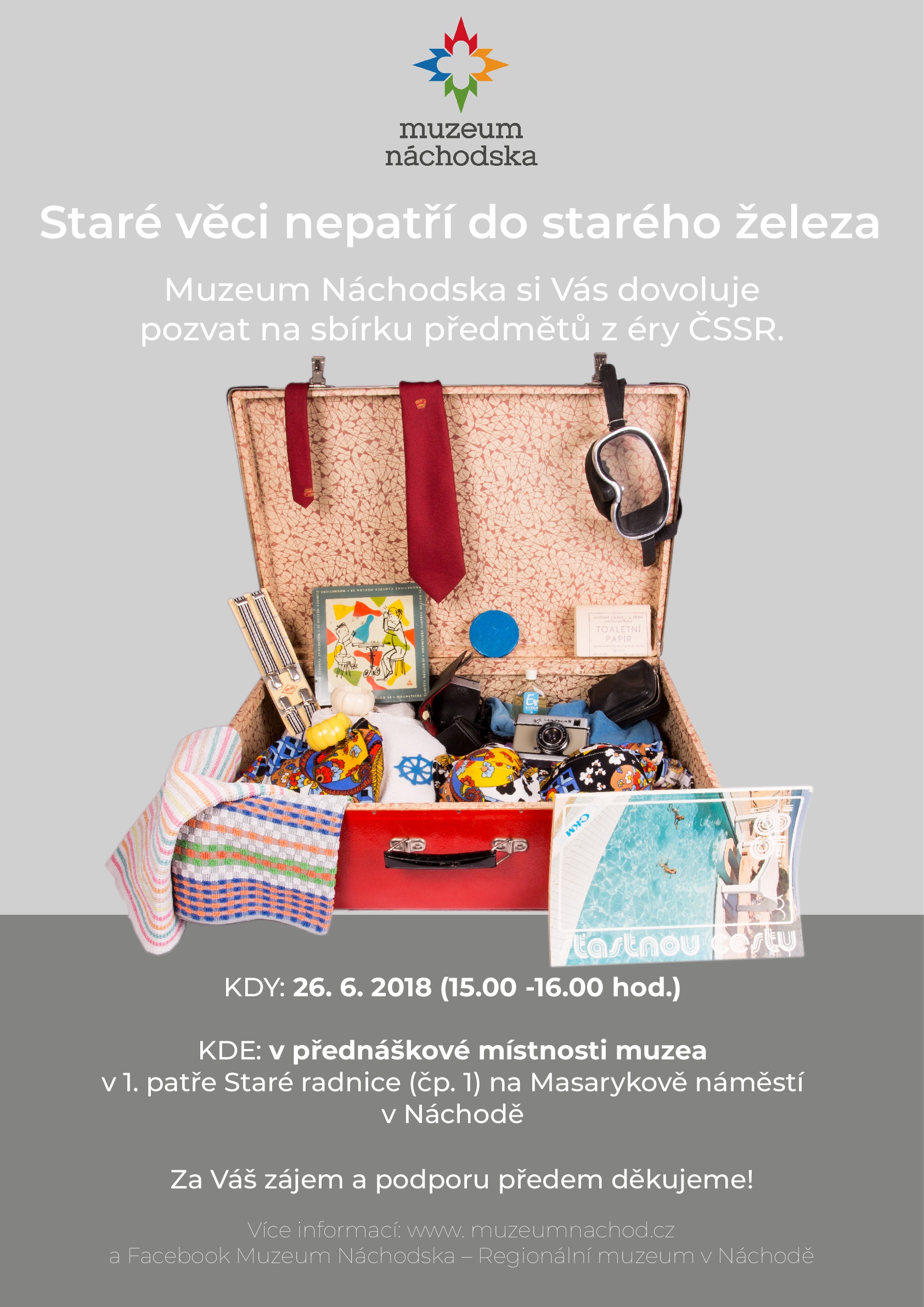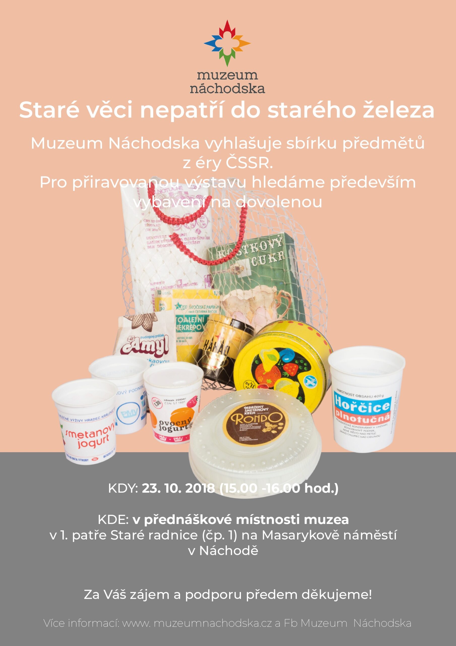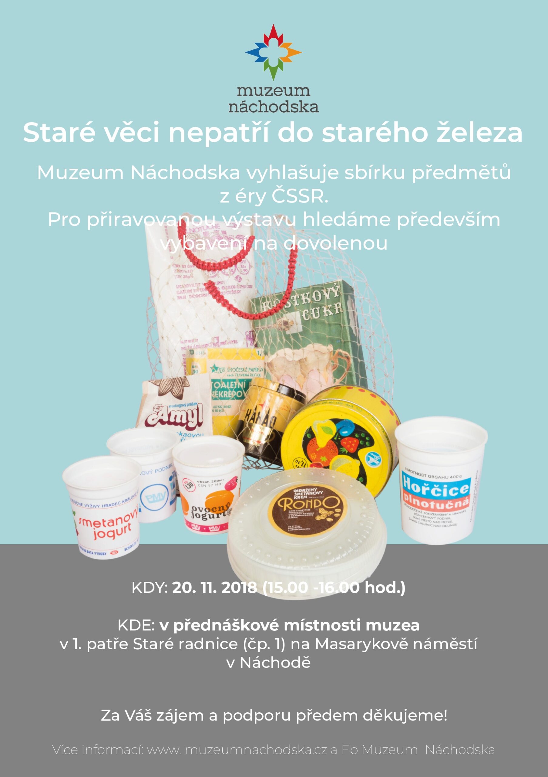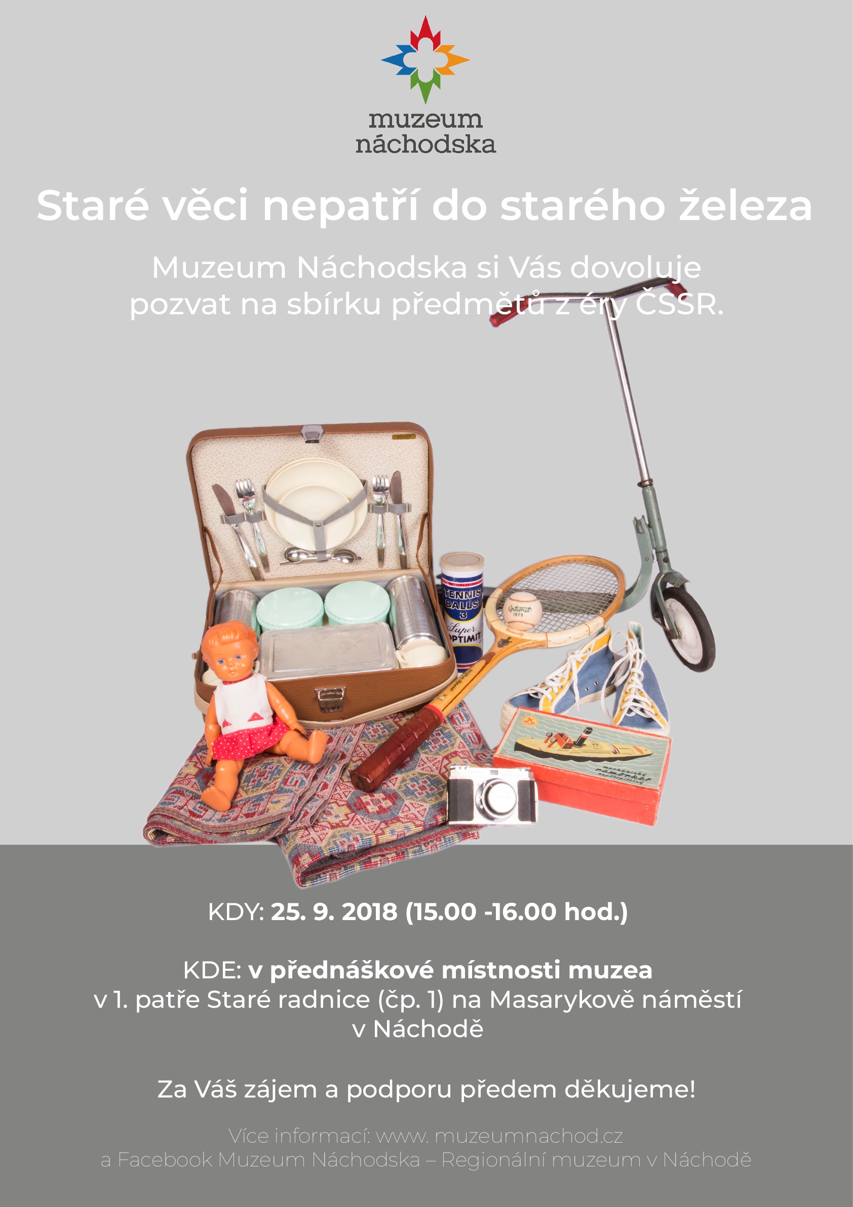 Muzeum Náchodska pořádá do konce roku 2019 sbírku všech retro, starých, nemoderních a dalšími přívlastky označovaných věcí, které se povalují u vás doma, ale je vám líto je jednoduše vyhodit. Pro mnohé lidi již nemají předměty, jež byly vyrobeny před rokem 1989, žádnou jinou hodnotu než tu sentimentální, i tak se však mezi nimi mohou skrývat poklady, kterým právem patří své místo v muzejních sbírkách.