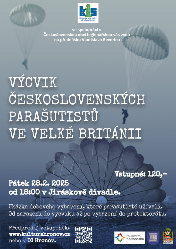 Ve spolupráci s KIS Hronov a Československou obcí legionářskou vás zveme na přednášku Výcvik československých parašutistů ve Velké Británii. Vladislav Severin vás na ní seznámí s procesem od zařazení do výcviku až po vysazení v Protektorátu. Uvidíte také ukázku dobového vybavení, které parašutisté používali.